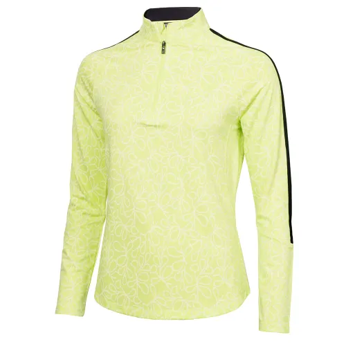 Printed, half zip performance top with solid contrast panel down sleeves.