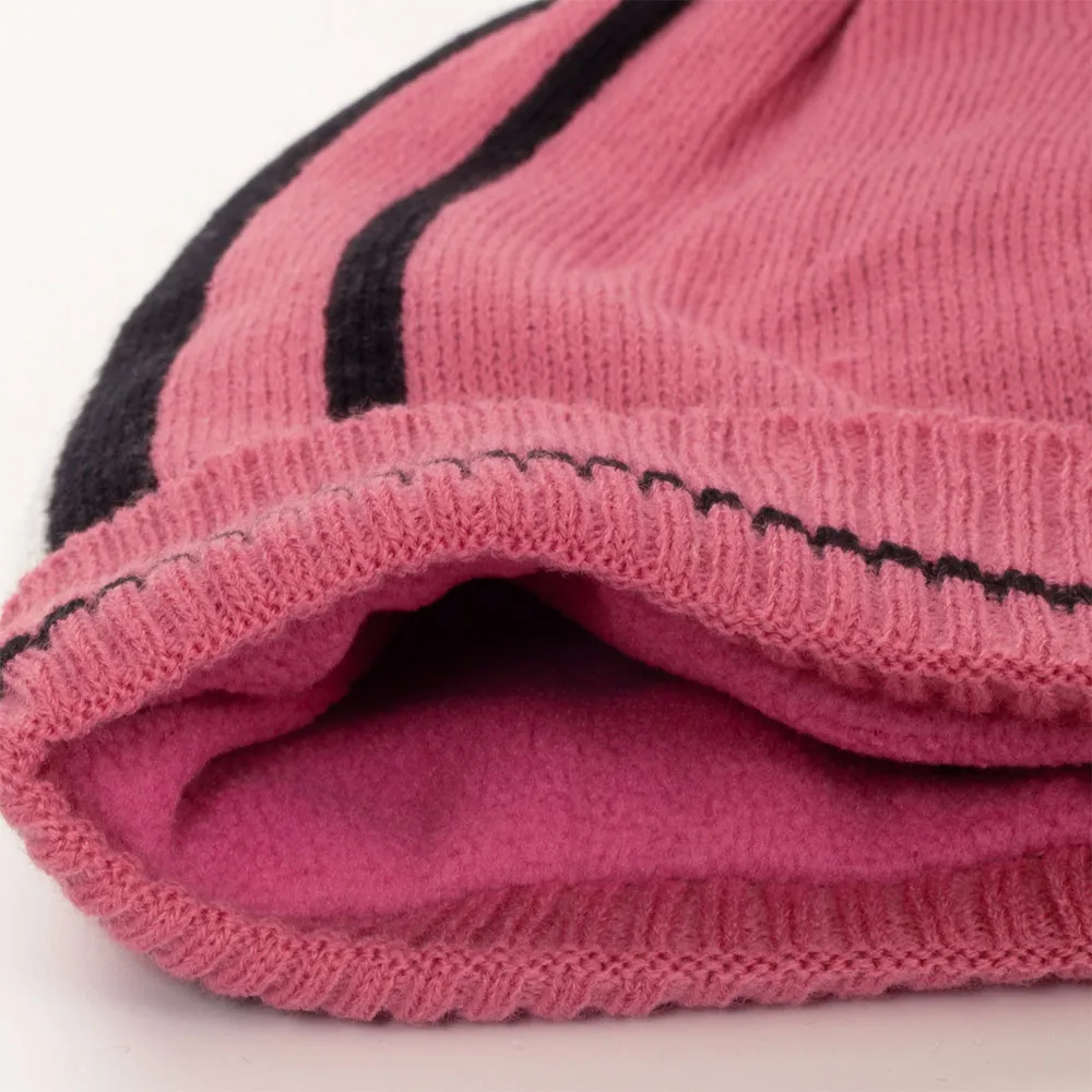 Neulottu pipo, jossa on kontrastiväriset raidat ja tupsu.