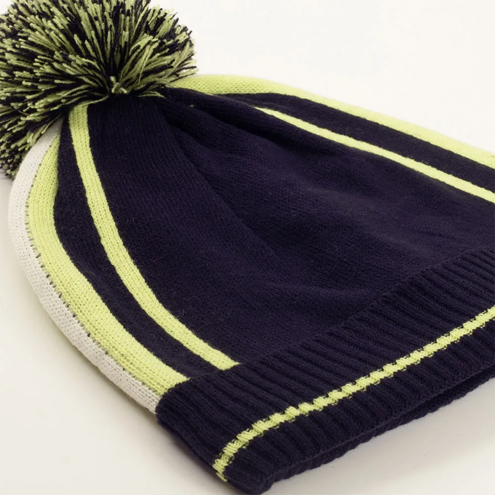 Neulottu pipo, jossa on kontrastiväriset raidat ja tupsu.