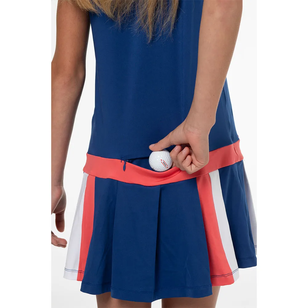 Laivastonsininen hihaton golfmekko sinisillä ja punaisilla yksityiskohdilla.