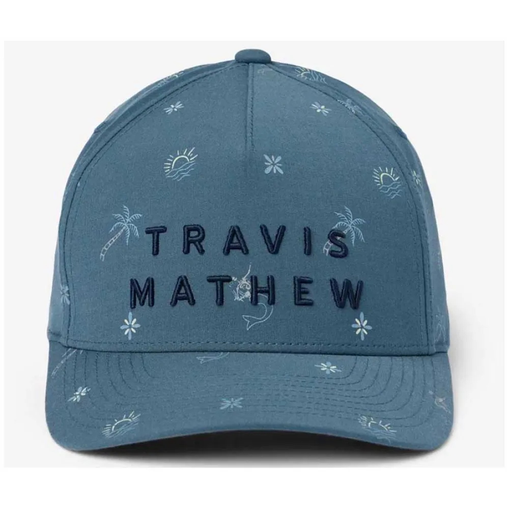 «COVE DIVE-capsen ble laget for gode tider med et allover-trykk med sol, palmer, havfruer og mer. Og så parret vi den med vårt stablede TravisMathew-logo foran og midt i bildet.