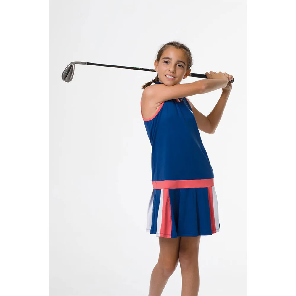 Marinblå ärmlös golfklänning med blå och röda detaljer.