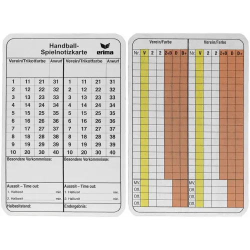 The clear and concise layout of the ERIMA Annotations For Cards facilitates quick and accurate recording. The pre-printed fields guide you through the necessary information, ensuring consistency and minimizing the risk of errors. This intuitive design allows for effortless note-taking, even during fast-paced gameplay. With these cards, you can easily track player numbers, foul types, time-outs, and other crucial details, providing a comprehensive record of the match.