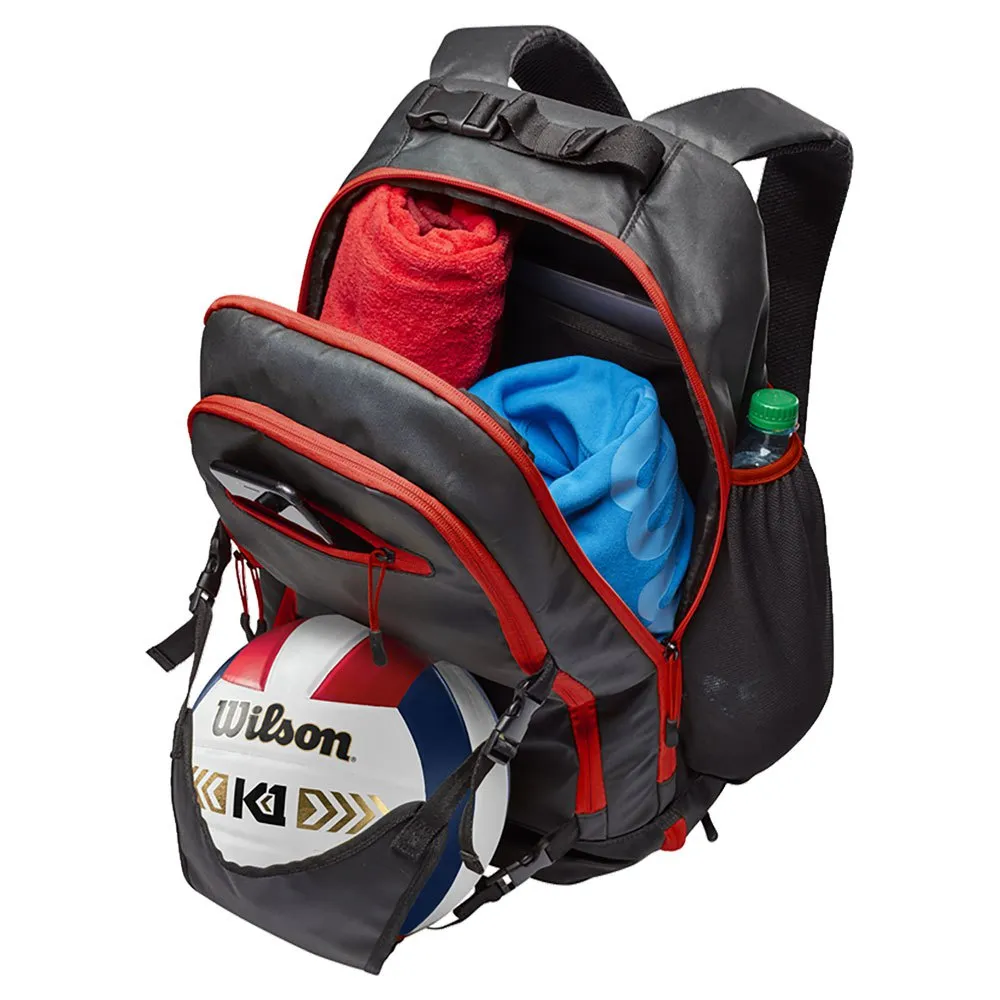 The Wilson Indoor Volleyball Backpack lets you conquer the beach and the indoors, in style. Built to cater to player needs, the bag comes equipped with speed clips for knee pads and wet clothes along with a front panel for easy volleyball transportation. An integrated sand trap release helps keep your bag clean while providing ventilation. Hidden pockets for personal belongings, and a cooler to keep your snacks fresh.