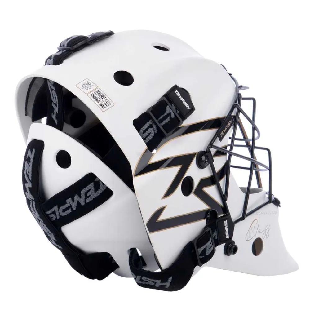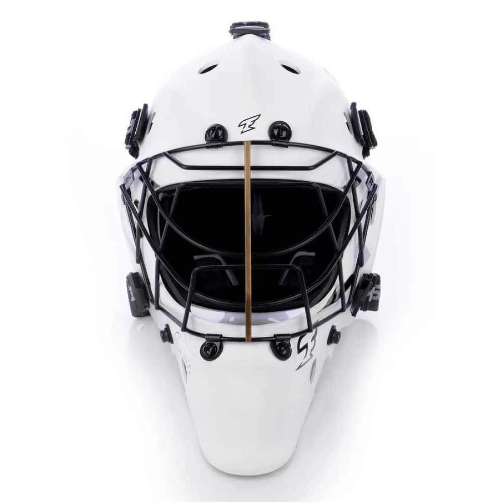 Klasse, der Nachfolger der äußerst beliebten Profi-Torwartmaske HERO ACTIV, jetzt in einem völlig neuen, dynamischen Design, das der aktiven Bewegung im Torraum entspricht. Die Maske besteht aus außergewöhnlich strapazierfähigem ABS-Kunststoff, der für die Bedürfnisse von Leistungs- und Profispielern entwickelt wurde. Die Maske ist IFF-zertifiziert und mit einer neuen anatomischen Polsterung mit verstellbarem Kinnschutz auf PE-Basis ausgestattet. Die Stirn liegt an einem austauschbaren, saugfähigen Band aus CoolMax-Material, das den Schweiß hervorragend ableitet. Die Maske passt sich dank ihrer Konstruktion, der Skelettform, der Innenpolsterung und dem Gurtmaterial perfekt an jede Kopf- und Gesichtsform an. Richtig platzierte Belüftungsöffnungen sorgen für eine hochwertigere Belüftung. Das Schutzgitter aus hochwertigem Stahl, das Gesicht und Augen schützt, wurde ebenfalls innoviert und sorgt zusammen mit der Form der Maske für eine perfekte Sicht auf das Spiel. Der verlängerte Teil unter dem Kinn schützt den Hals. Gummierte Riemen erleichtern die Einstellung.