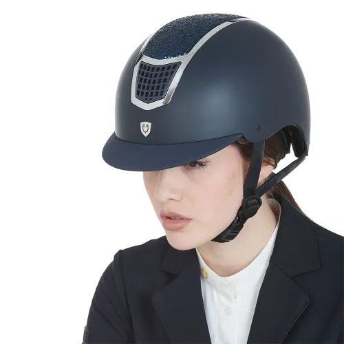 Den ydre skal er mat og udsmykket med tone-i-tone rhinsten, der gør hjelmen raffineret og elegant, med luftindtag foran og en plade med Equestro-logo.