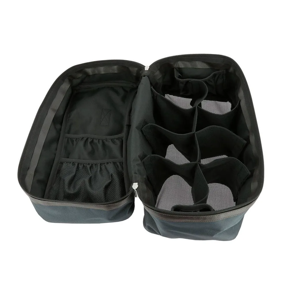 I vandtæt, 1680D PVC-belagt polyester. Etui i forfængelig størrelse med 2-vejs lynlås har et håndtag med 2 ringe til en skulderrem. Bunden er lavet af 100% åndbar polyester. Indersiden er polstret og indeholder 8 aftagelige selvgribende rum (ideelt til 2 sæt af 4 bandageomslag), 2 stræklommer på siderne og 2 stræklommer - den ene i mesh-stof - på indersiden af låget.