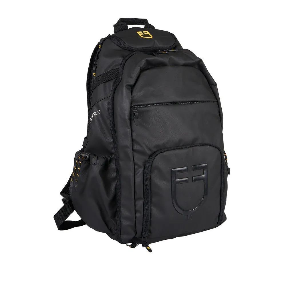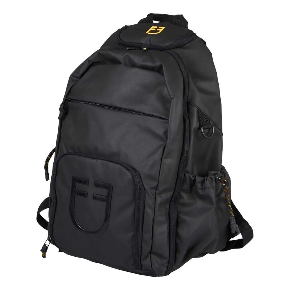 Er verfügt außerdem über einen 3D-gedruckten weißen Equestro-Schriftzug auf der rechten Seite, ein 3D-gedrucktes gelbes Equestro-Logo auf der Oberseite des Rucksacks und einen 3D-Druck des Equestro-Logos in glänzendem Schwarz auf der Vordertasche