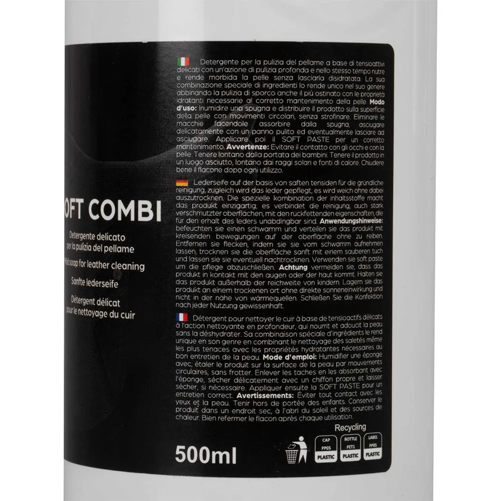 Acavallo Soft Combi is a delicate leather detergent (soap) based on surfactants with a deep cleansing action, nourishing and softening at the same time, without leaving the leather dehydrated.
