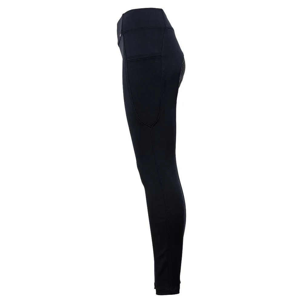 The riding tights are made of sturdy and durable 4-way stretch fabric for a pleasant, tight fit and a lot of freedom of movement. The elastic waistband without closure also contributes to the good fit. On both sides there is a deep side pocket that is suitable for putting in a mobile phone. The silicone seat with stylish dot pattern provides extra grip and a stable seat.