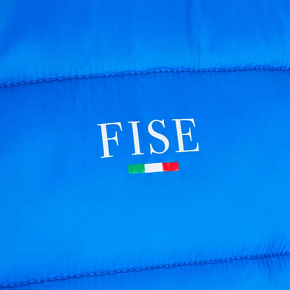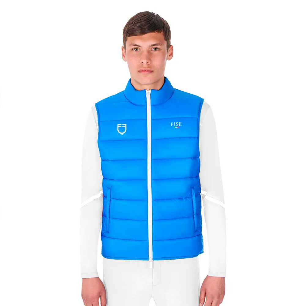 La prenda está adornada con un cierre de cremallera con sistema cortavientos y dos bolsillos laterales, así como un ribete de cordón con la bandera italiana a lo largo de los lados y el logotipo de Equestro X FISE en el pecho.