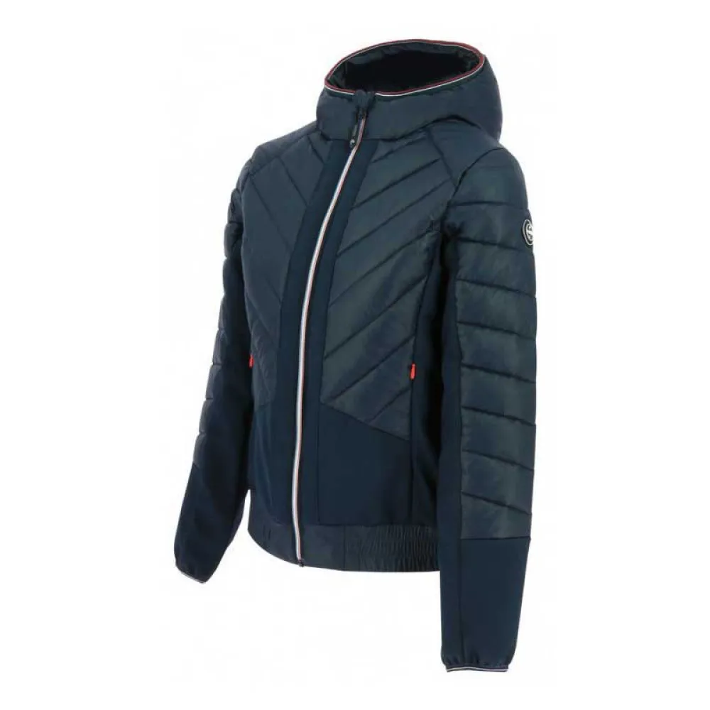 Chaqueta híbrida con capucha aislante y canesú softshell para mayor elasticidad.