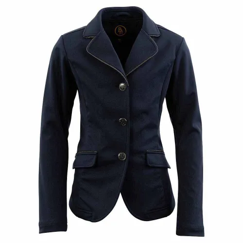 Questa bellissima giacca da competizione per bambini non è solo piacevole da indossare, ma ha anche un aspetto elegante grazie al piping nero e lucido lungo il colletto e sopra le tasche e ai bottoni neri glitterati.