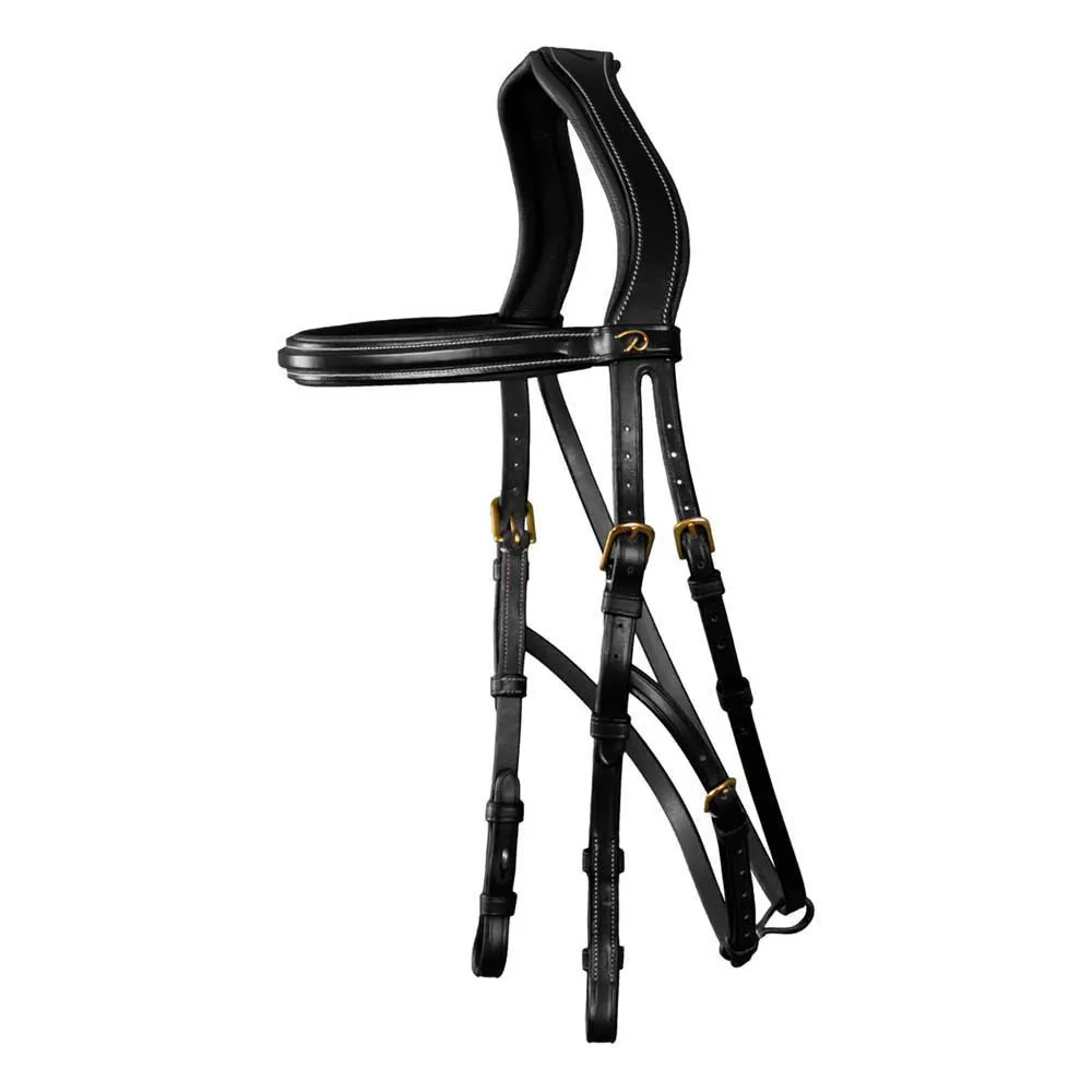Frontalino leggermente squadrato e rialzato con impunture decorative. La testiera ha un unico montante per l´hackamore. Montanti dell´hackamore con cinturino regolabile sotto le guance per mantenerli in posizione.