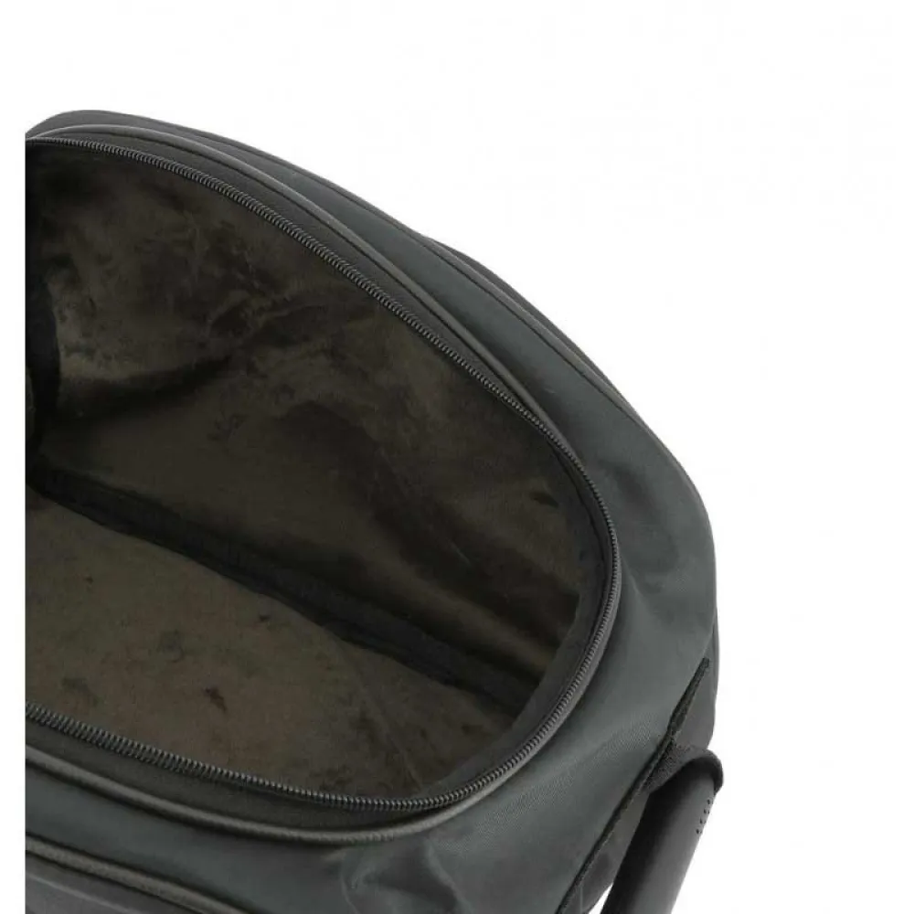 In poliestere 600D lucido. Interno in ecopelliccia, zip a 2 vie sul lato anteriore e una tasca laterale. Manico in plastica per un facile trasporto. Fodera 100% cotone. Borchie protettive e piastra di rinforzo sul lato inferiore.