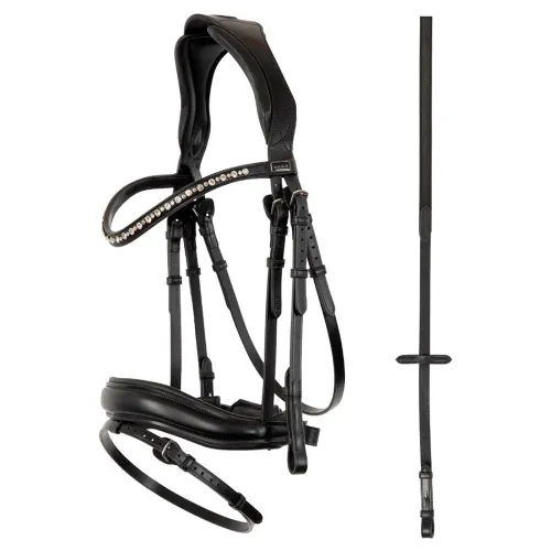 De licht gebogen Rivets frontriem met glanzende imitatie diamanten van Stellux™ in twee verschillende maten geven dit hoofdstel een stijlvolle touch. Het hoofdstel is gemaakt van hoogwaardig Engels leer en wordt geleverd met een antislip teugel met teugelstop.