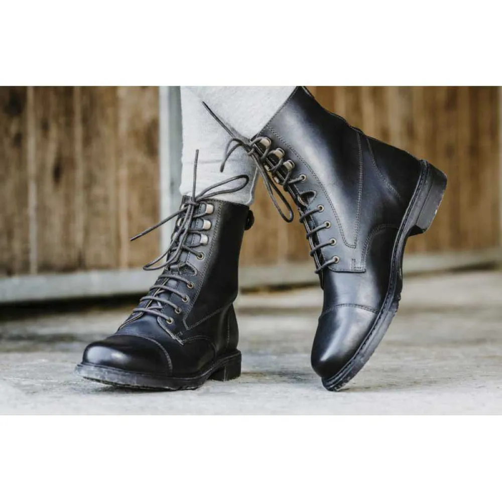 De Dandy laarzen zijn gemaakt van prachtig, volnerf rundleer en hebben een verfijnd en gestroomlijnd silhouet dat het been verlengt voor een flatterende, professionele look. Het bepalende kenmerk is de traditionele decoratieve vetersluiting aan de voorkant, vastgemaakt met handige haken aan de bovenkant. Dit klassieke detail is niet alleen voor de show; het zorgt voor een perfect aangepaste pasvorm rond de enkel en kuit, waardoor een nauw contactgevoel wordt gegarandeerd zonder in te boeten aan comfort. Deze op maat gemaakte aanpassing zorgt ervoor dat de laarzen vanaf de eerste rit aanvoelen als een tweede huid en zich aanpassen aan uw unieke vorm.