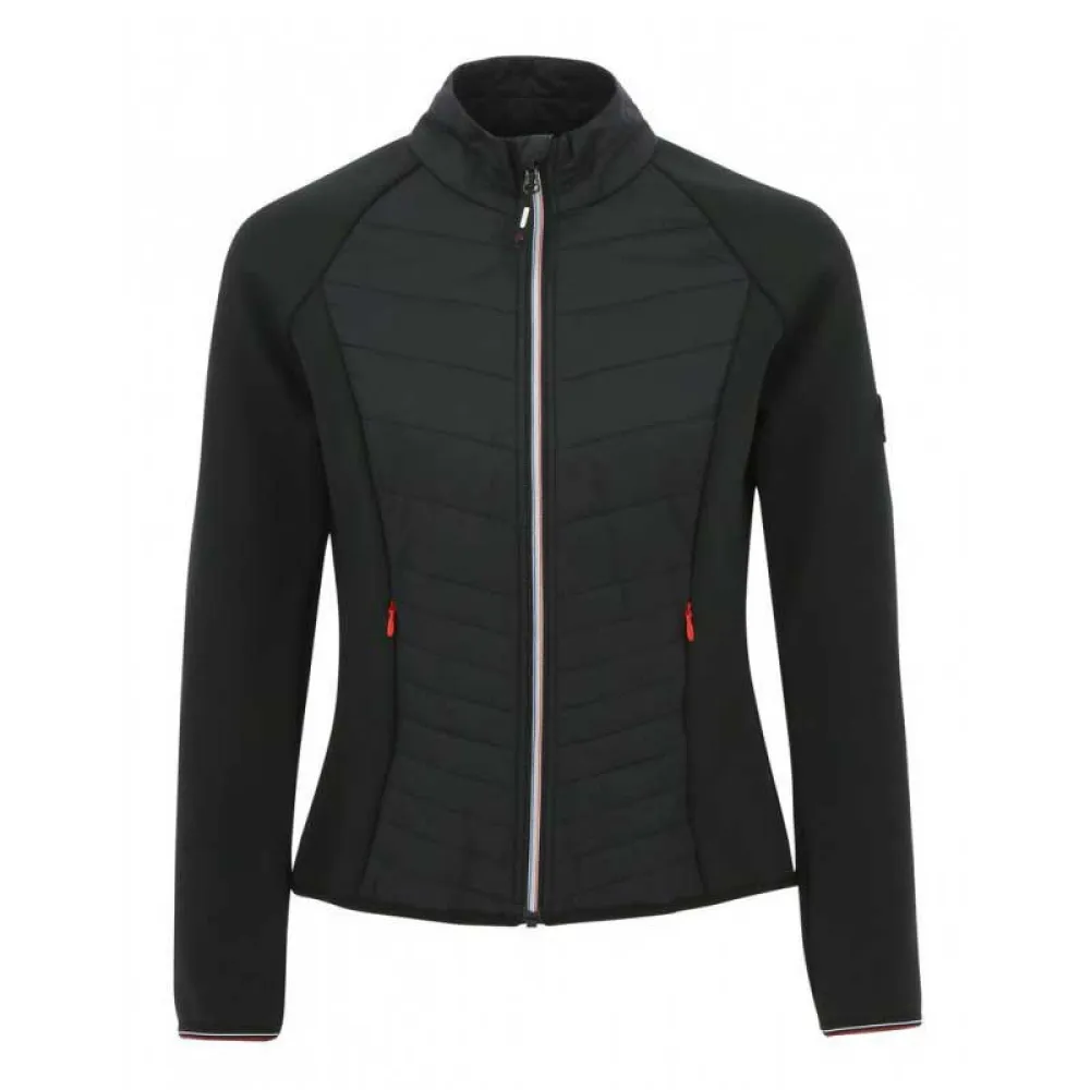 Hybride waterafstotende en comfortabele jas. Het kan alleen of onder een jas worden gebruikt en zal je al het comfort bieden dat je nodig hebt tijdens het paardrijden. Samenstelling: hoofdstof: 85% polyamide, 15% elasthaan, contrasterend materiaal: 86% polyester, 14% elastaan, voering: mesh 100% Polyester. Machinewasbaar op 30°.