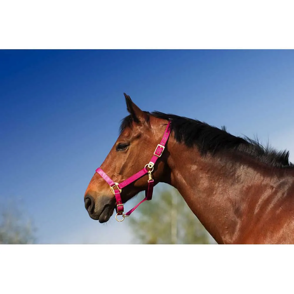 Grime laget av myk og sterk anti-gnag nylon. Med veldig fine sink- og stålspenner uten skarpe kanter, i sateng-finish, og stemplet med Equithème-logoen. Justerbar nesebøyle og hodebøyle med spenner, og hurtigutløsende karabinkrok i halsen.