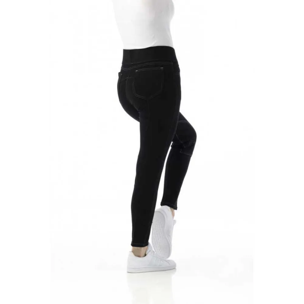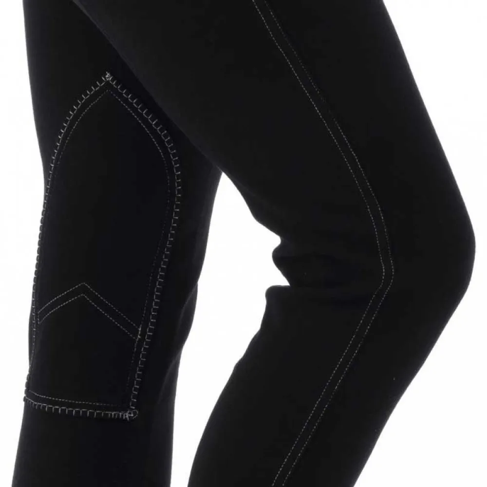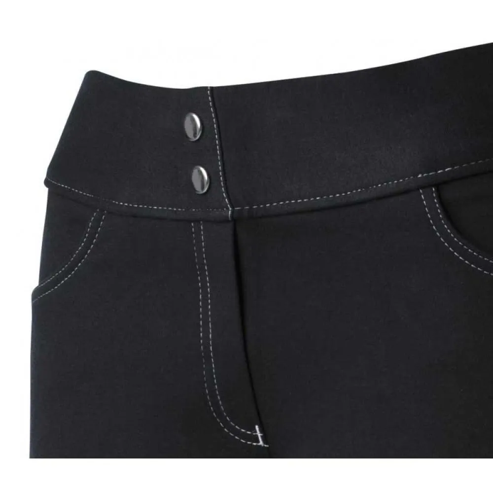 Veldig behagelige ridebukser som er enkle å ta på, ingen knapp og ingen glidelås! Elastisk underben, 2 rytterlommer på forsiden og 2 flate lommer på baksiden. Kontrasterte stikninger, knelapper i stoff og elastisk midjebånd.