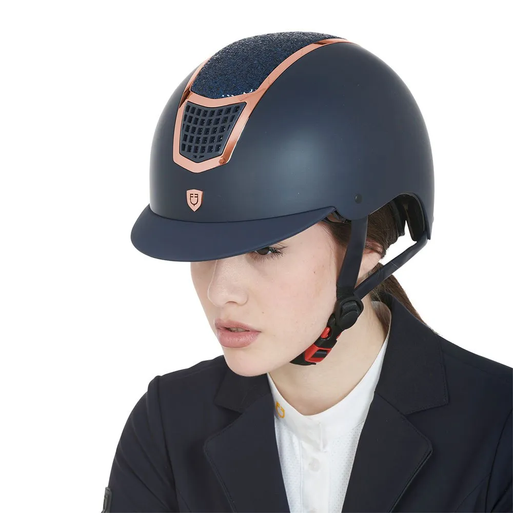 Obudowa zewnętrzna jest nieprzezroczysta, ozdobiona aplikacją kryształków w kolorze kasku, co nadaje mu wyrafinowany i elegancki wygląd, z przednimi wlotami powietrza i płytką z logo Equestro.