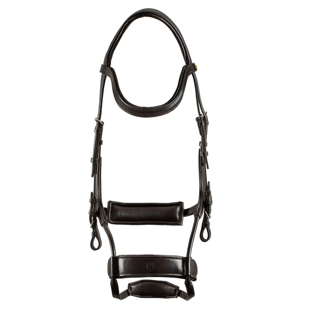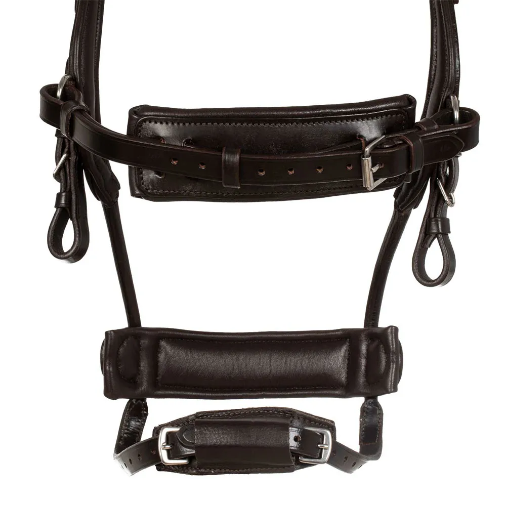 A muserola também é ergonomicamente projetada para aliviar a pressão na mandíbula superior e nos dentes molares, e a lateral e a focheira acolchoada aliviam a pressão dos nervos faciais para maior conforto.