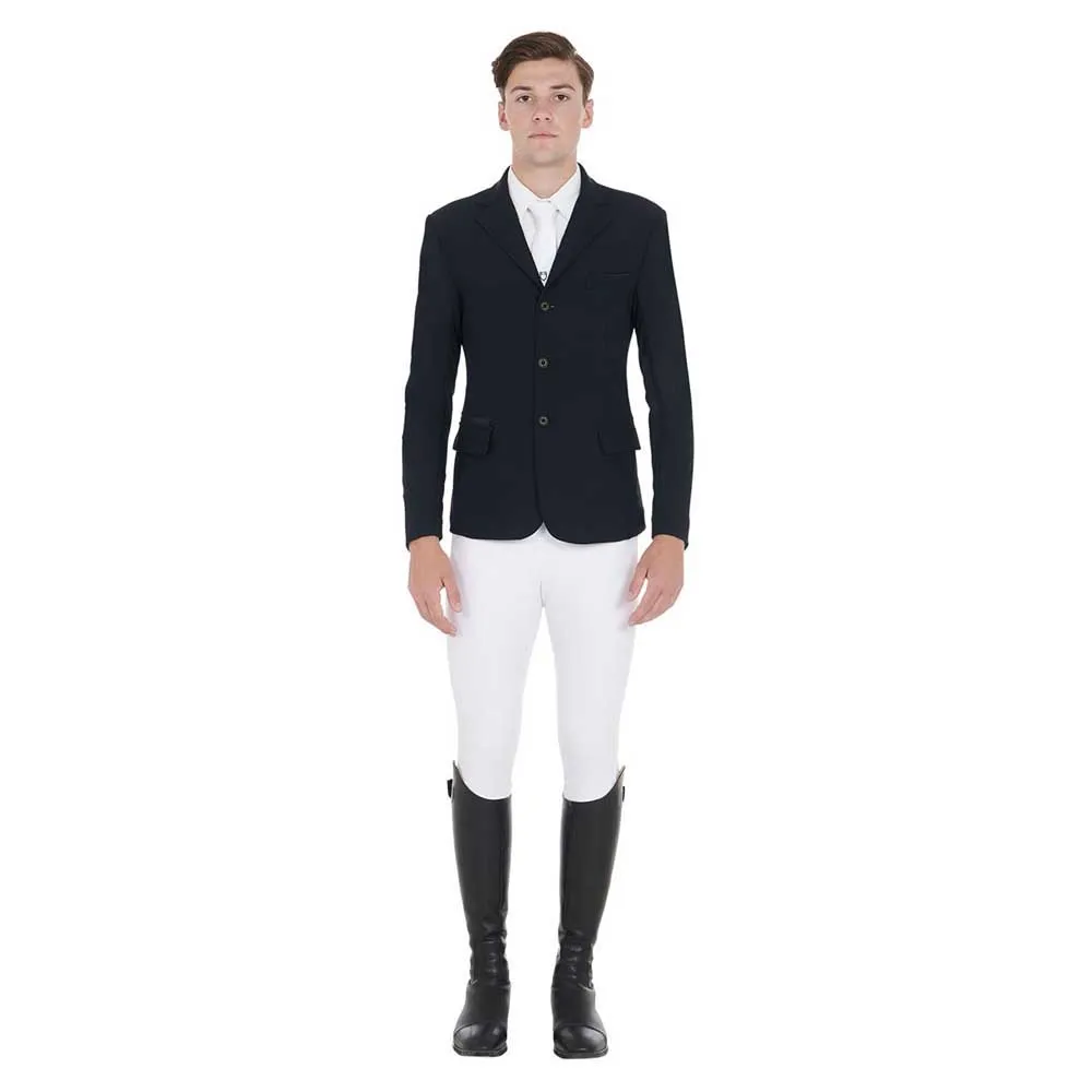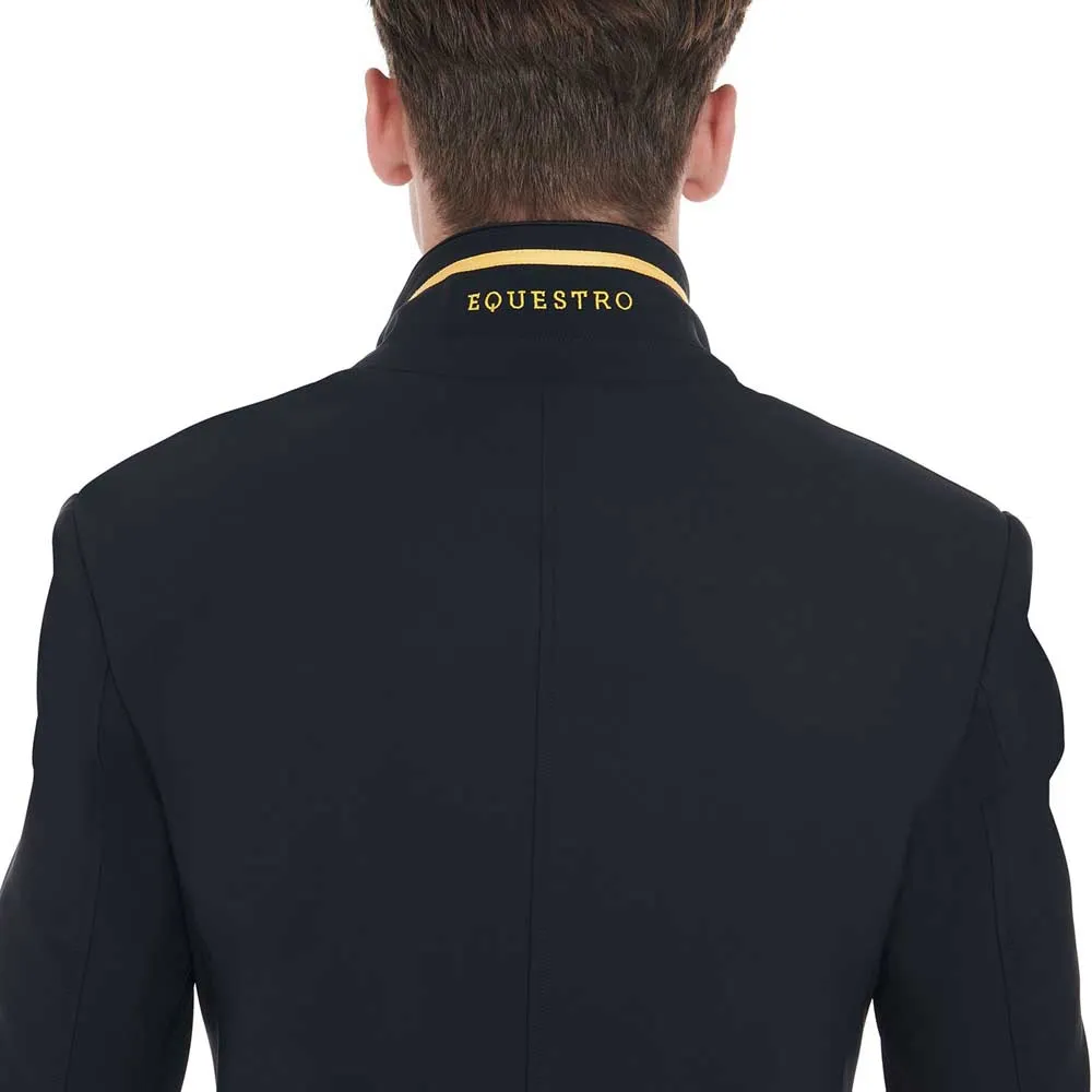 Casaco de competição masculino com fecho de correr no bolso direito. É concebido com tecido técnico respirável e ultraleve de excelente qualidade, garantindo assim um ajuste perfeito, máximo conforto e liberdade de movimentos. A peça é elegante graças aos três botões frontais e também prática com os seus dois bolsos frontais e o prático bolso localizado no lado esquerdo do peito. A estrutura ergonómica torna o casaco particularmente adequado para uso desportivo sem descurar a elegância típica dos produtos Equestro, graças aos detalhes contrastantes.