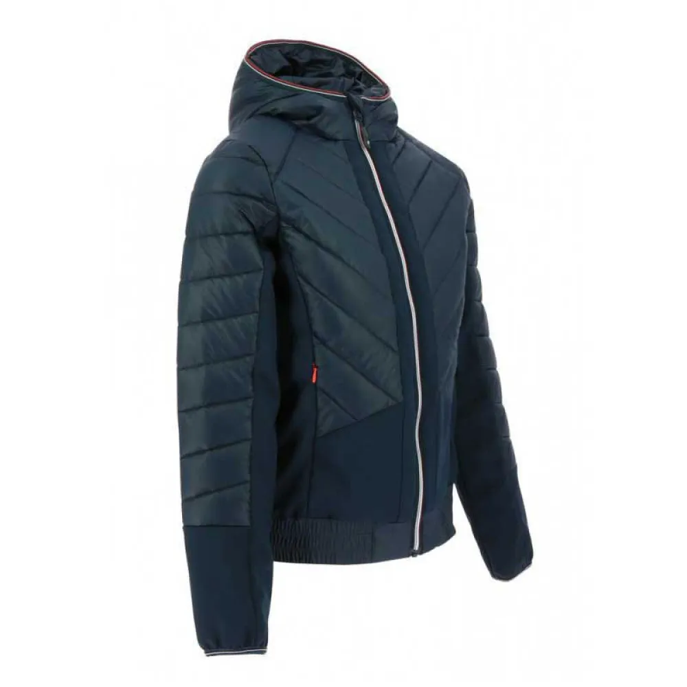 Jaqueta híbrida com capuz isolante e garfos softshell para elasticidade.