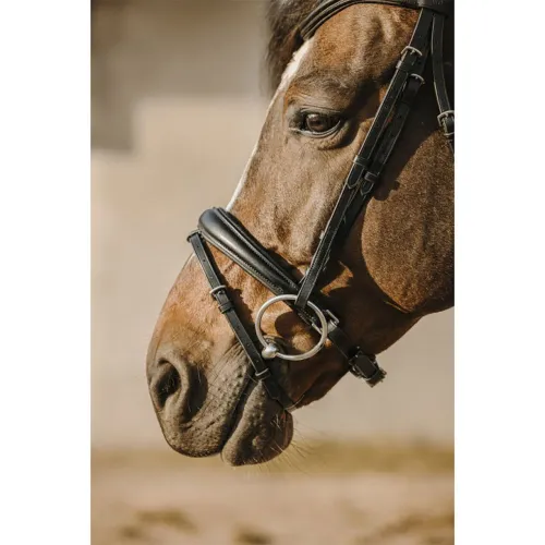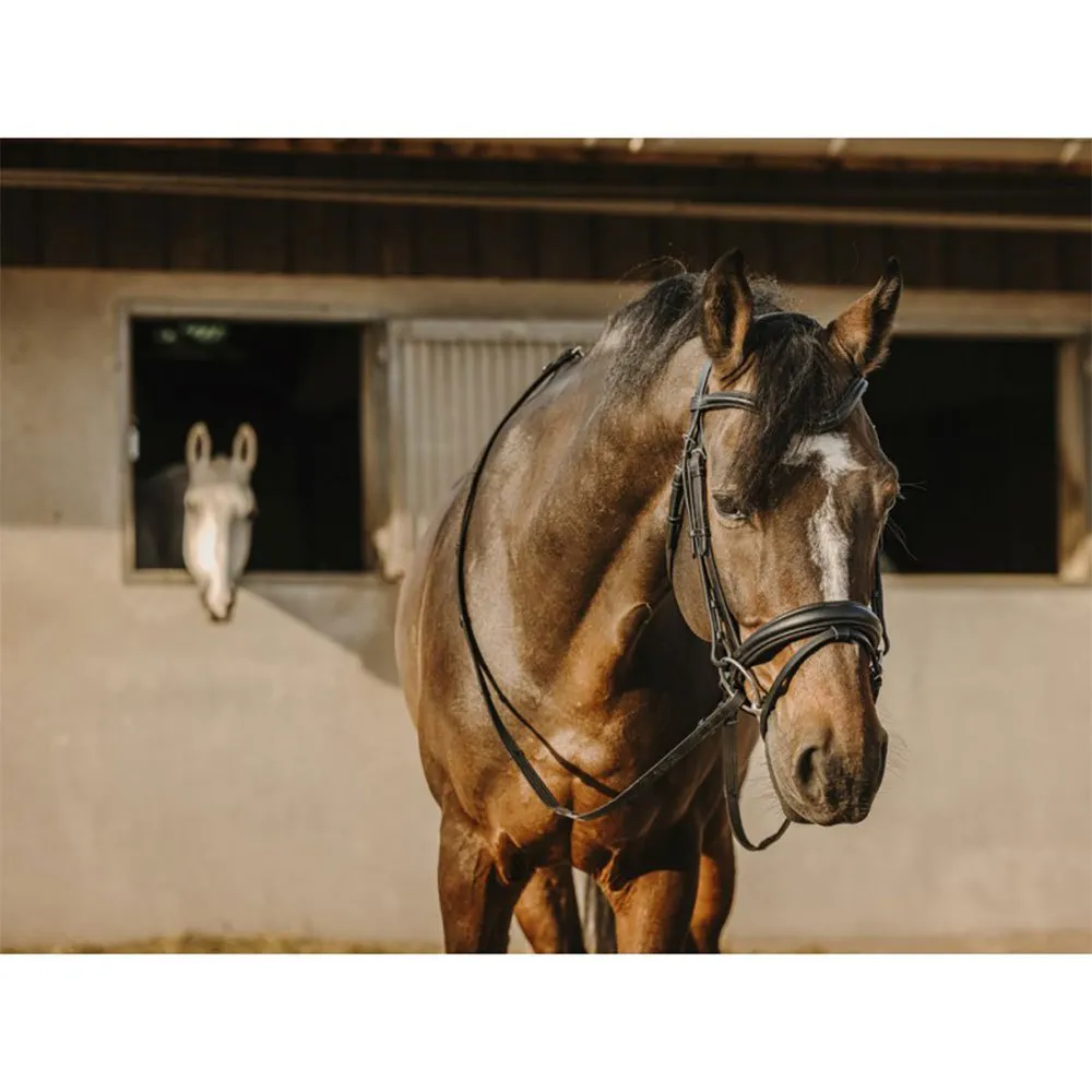 Feita de couro curtido vegetal flexível, a cabeçada amacia e se molda à cabeça do cavalo ao longo do tempo, garantindo um ajuste personalizado e o máximo conforto. A testeira acolchoada aumenta ainda mais o conforto, distribuindo uniformemente a pressão pela nuca, minimizando o desconforto e incentivando um porte de cabeça relaxado.
