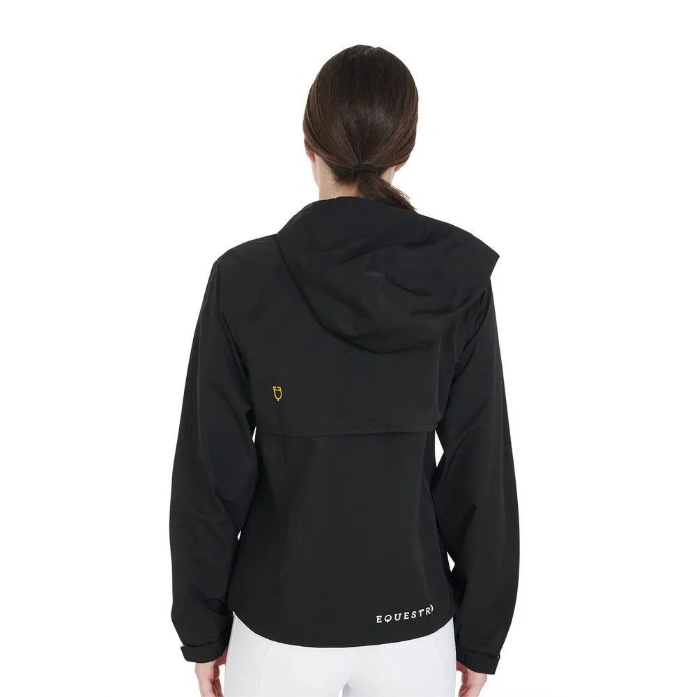 Damernas regnrock tillverkad av tekniskt material med tre lager tyg med en andningsbar och vattenavvisande membran som garanterar maximalt skydd mot vatten och hög rörelsefrihet.