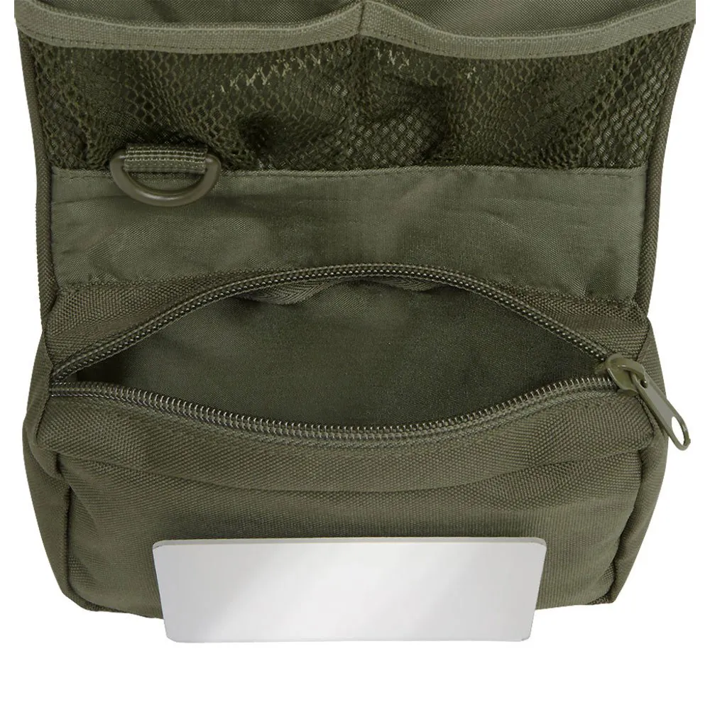 Robust 600DEN polyestermateriale, 1 lynlåsrum, 2 meshlommer med elastik, 1 stort udfoldeligt rum med lynlås (16 cm x 10 cm), aftageligt, knusesikkert spejl, ekstra velcrooverflade til spejlet, roterende plastkrog til ophængning, spænde aflåselig, håndbærende løkke, D ring, højde 13 cm x bredde 16 cm x dybde 5 cm højde 36 cm x bredde 16 cm x dybde 3 cm (udfoldet).