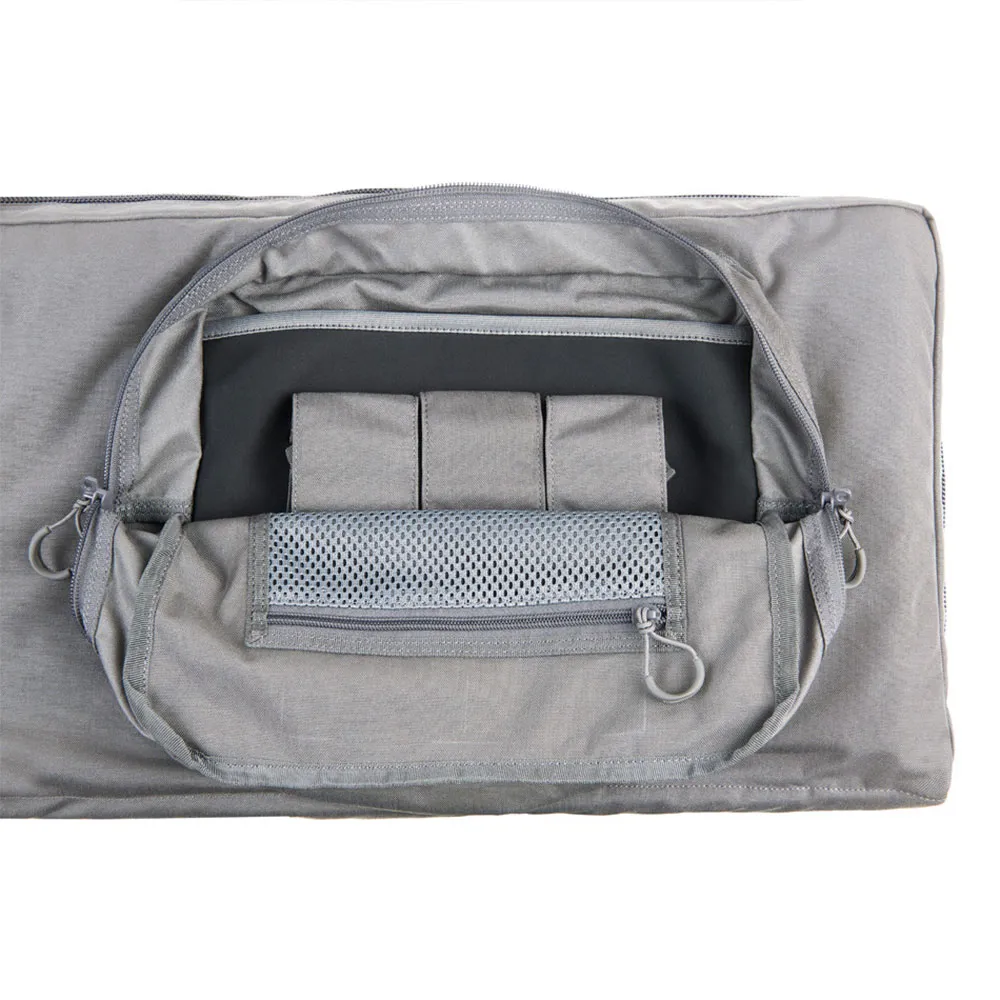 Im Inneren können 2 Gewehre untergebracht werden, die durch einen zentralen Teiler, Seitenklappen und einen gepolsterten Rand perfekt geschützt sind.
