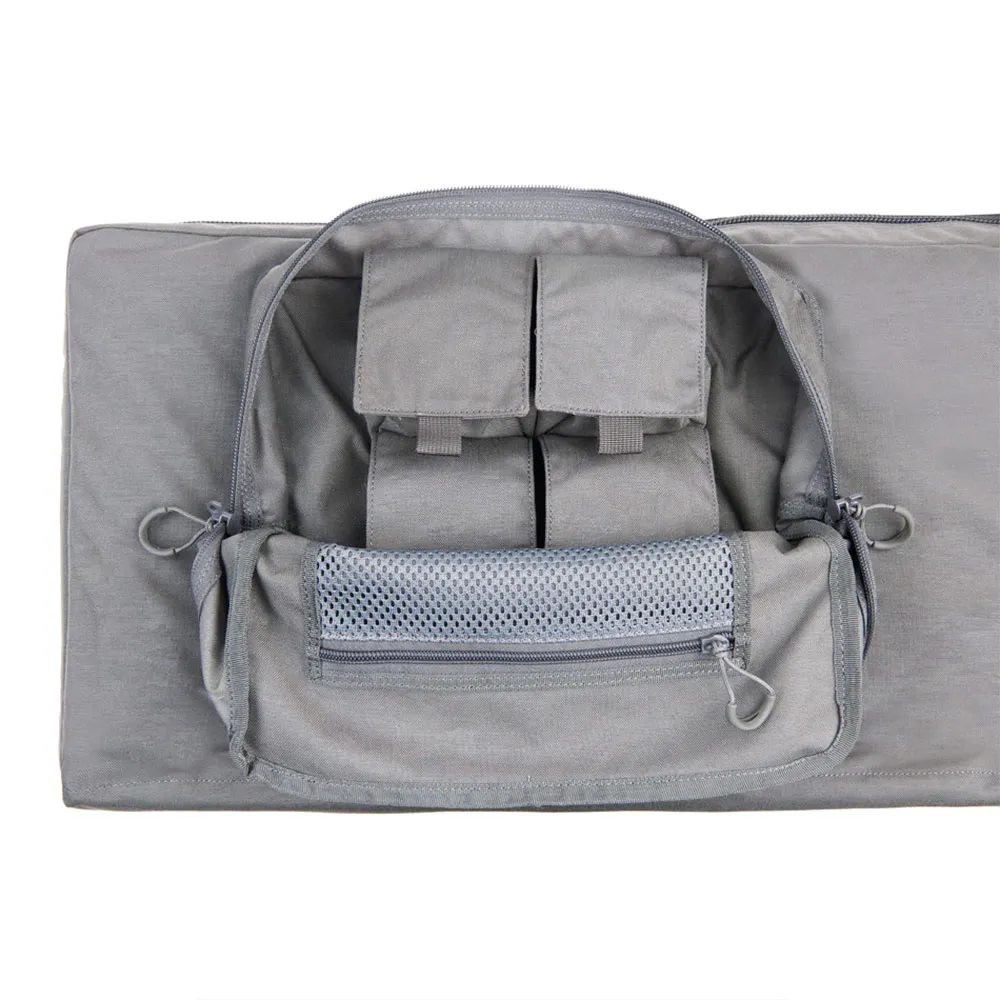 In der rechten befindet sich eine Neoprenhülle zum Aufbewahren und Schützen einer Handfeuerwaffe sowie 3 Klapptaschen für Handfeuerwaffenmagazine (12x6 cm) und eine Reißverschlusstasche aus Mesh mit 20x15 cm.