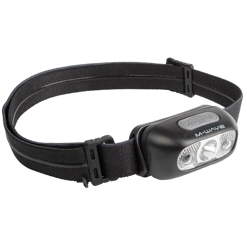 Kopflampe > Helios Runner 140> M-WAVE, 1 x 5-Watt-LED, Größe: 58x29x32mm nur, 3 Helligkeitsstufen + SOS-Blinkfunktion, optionaler Aktivierung des Näherungssensors für Gestensteuerung, verstellbarer Winkel, max.