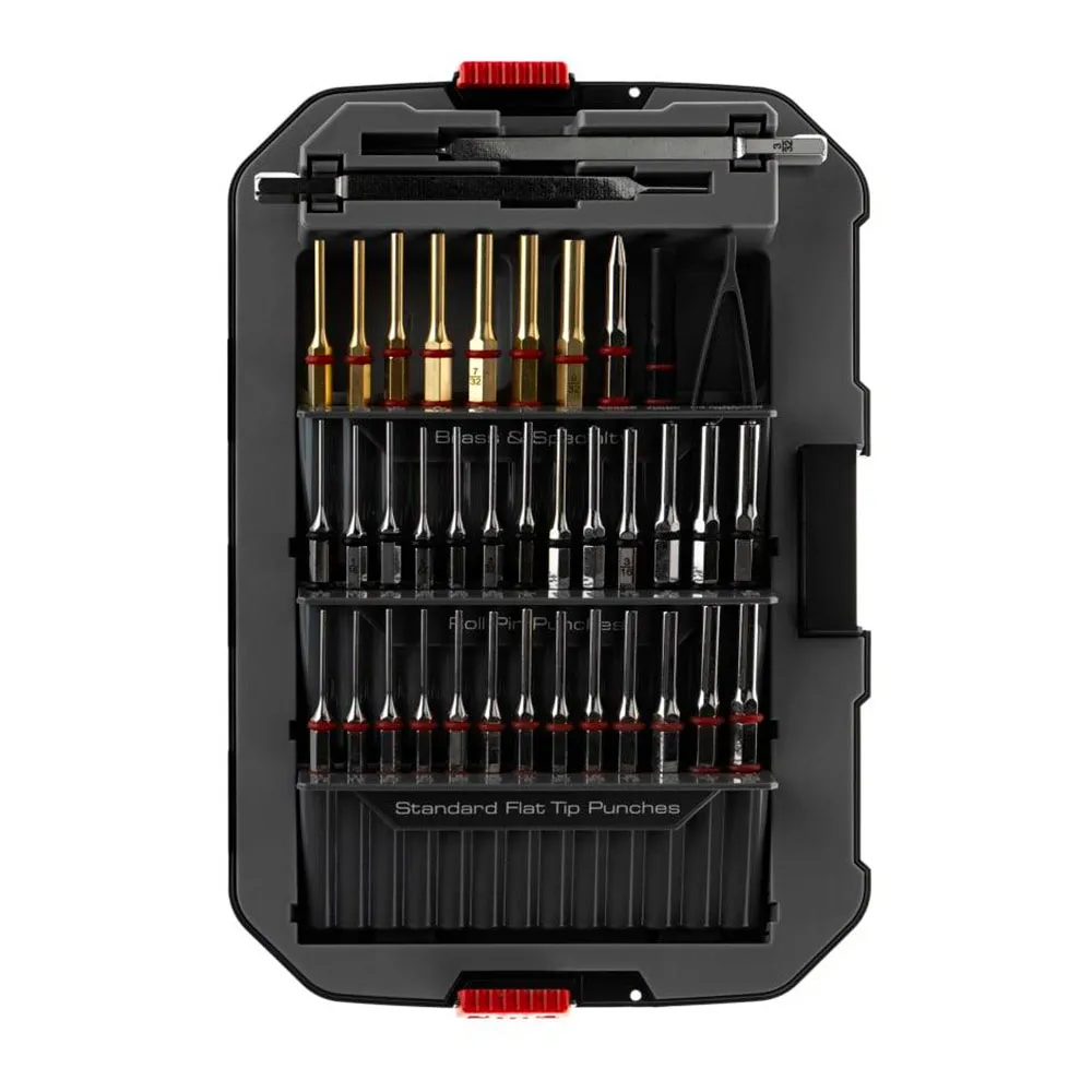 Komplettes Durchschlag- und Hammersystem: Ein umfassendes Sortiment an sorgfältig organisierten Durchschlägen und ein vielseitiger Büchsenmacherhammer zur Bearbeitung einer Vielzahl von Stiftgrößen und -typen, die in modernen und klassischen Schusswaffen zu finden sind.