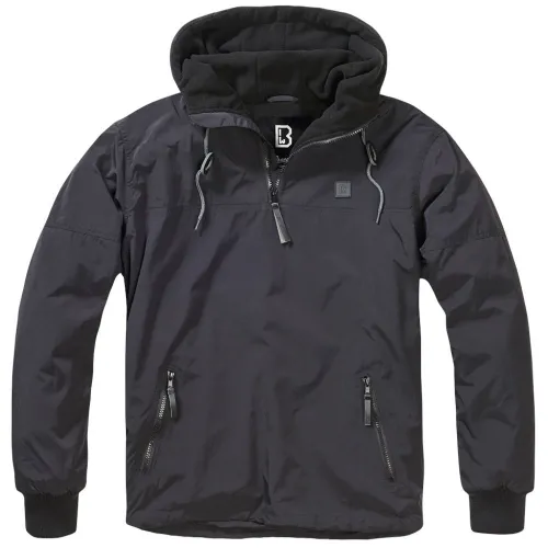 fleecelining, wind- und waterrepellent, extra long side-zipper, zip-pockets, ribbed cuffs, hood with drawstring, Brandit leather patch on chest.