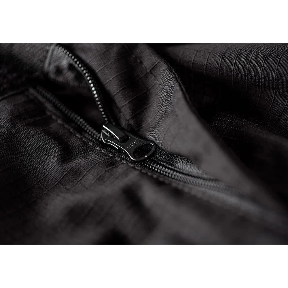 - At the front, we can find high-quality YKK zipper with hook and loop closure. A strap runs around the inner waistband to adjust its size. Similar straps are located around the ankles to adjust fit to the user footwear.