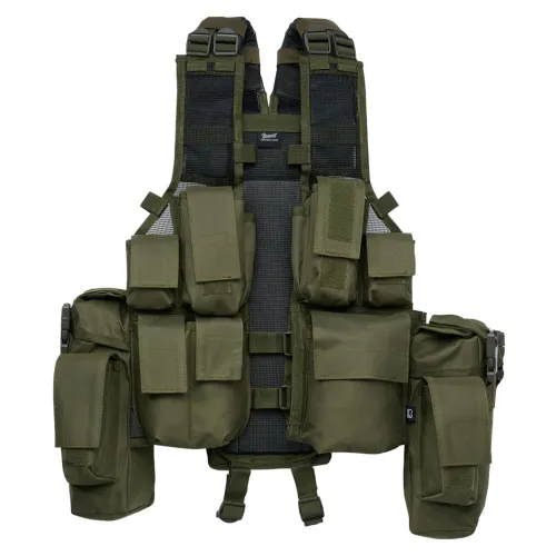 Chaleco táctico todoterreno con, frontal :, 6 bolsillos frontales con velcro, compartimento adicional para bolígrafos tácticos, bolígrafos, barras luminosas, etc., superficie de parche vertical, 4 pequeñas presillas para entrada de cables o equipo adicional, cierre principal con 2 hebillas de liberación rápida, longitud ajustable, acolchado, correas de hombro ajustables en longitud, lados :, 2 compartimentos grandes (25 x 12 x 9 cm) con hebillas de liberación rápida, Acceso rápido con tapa de velcro, 2 bolsillos pequeños adjuntos con velcro, cintura ajustable con 4 correas a cada lado, acolchado de cadera con red subyacente, respaldo :, 1 gran compartimento trasero con cremallera y tabique en el tercio inferior (45 x 15 x 8 cm), 2 presillas verticales ajustables para equipamiento adicional, 2 presillas horizontales, regulables y desmontables para equipamiento adicional, Acceso rápido con tapa de velcro, sistema MOLLE, superficie de parche horizontal, acolchado en la espalda con capa de red.