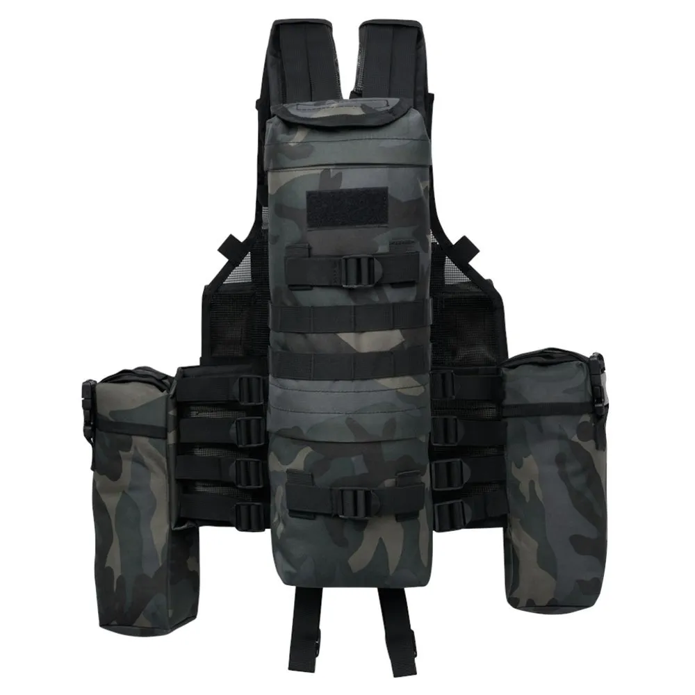 Chaleco táctico todoterreno con, frontal :, 6 bolsillos frontales con velcro, compartimento adicional para bolígrafos tácticos, bolígrafos, barras luminosas, etc., superficie de parche vertical, 4 pequeñas presillas para entrada de cables o equipo adicional, cierre principal con 2 hebillas de liberación rápida, longitud ajustable, acolchado, correas de hombro ajustables en longitud, lados :, 2 compartimentos grandes (25 x 12 x 9 cm) con hebillas de liberación rápida, Acceso rápido con tapa de velcro, 2 bolsillos pequeños adjuntos con velcro, cintura ajustable con 4 correas a cada lado, acolchado de cadera con red subyacente, respaldo :, 1 gran compartimento trasero con cremallera y tabique en el tercio inferior (45 x 15 x 8 cm), 2 presillas verticales ajustables para equipamiento adicional, 2 presillas horizontales, regulables y desmontables para equipamiento adicional, Acceso rápido con tapa de velcro, sistema MOLLE, superficie de parche horizontal, acolchado en la espalda con capa de red.