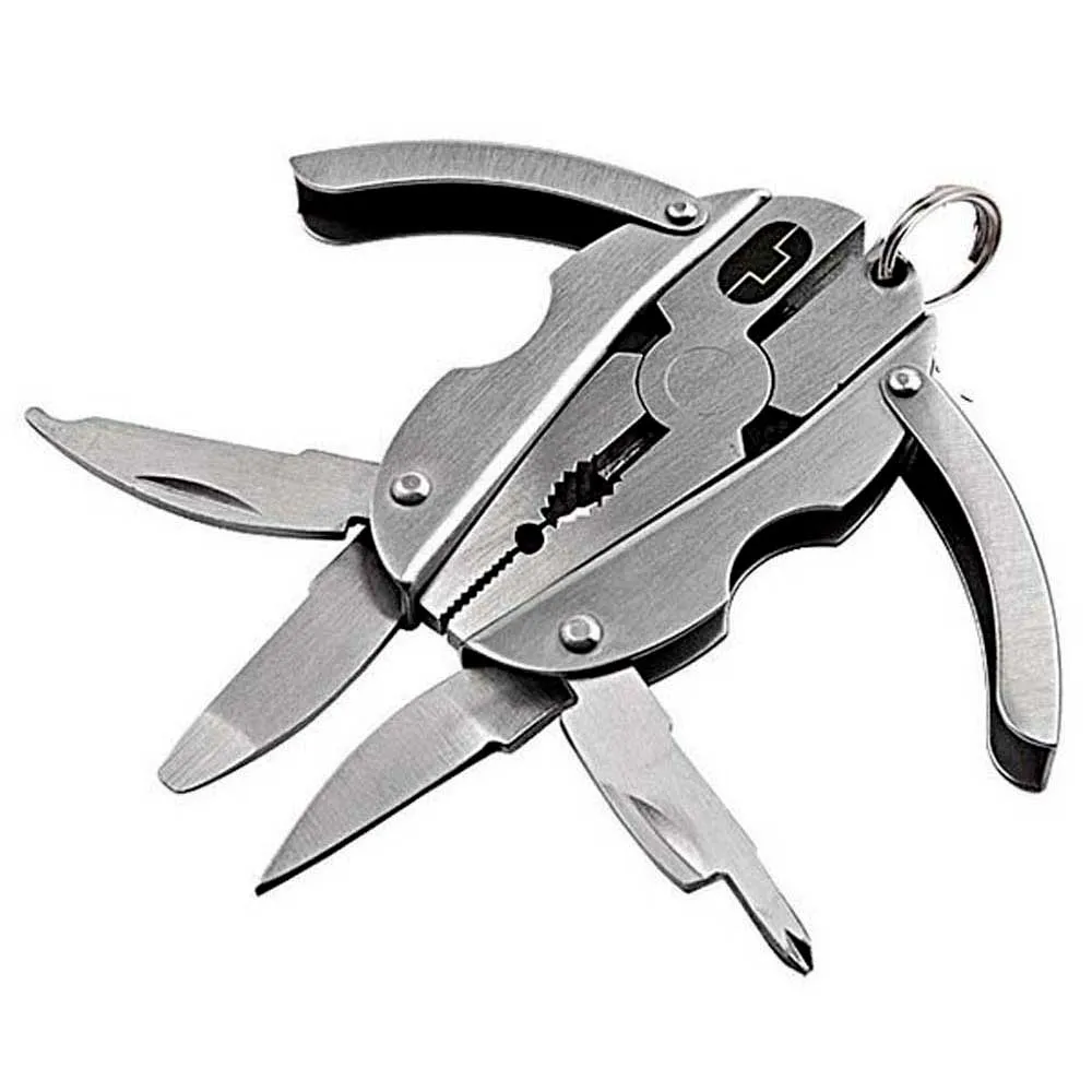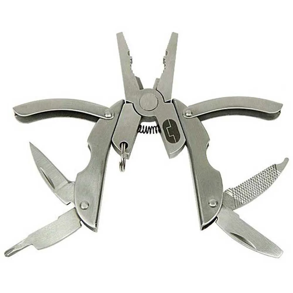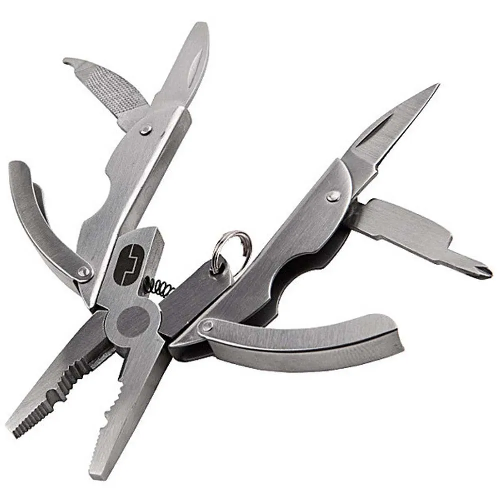 Su diseño único de la manija plegable y contorneada hace esta multi herramienta muy cómoda y compacta. Alicates y pelacables, destornillador Phillips, cuchillo, lima, destornillador plano y llavero desprendible.. L50 x W35 x D7mm