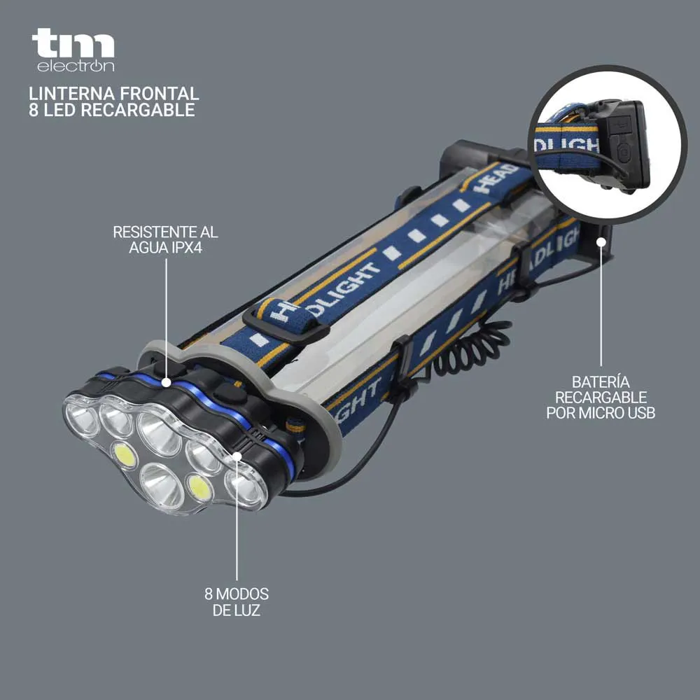 - Lampada frontale con 8 LED super luminosi con archetto regolabile.