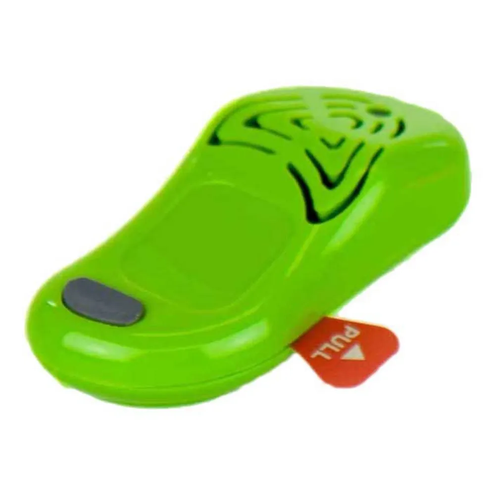 Verwijder het lipje om het apparaat te activeren. Druk op de knop om het apparaat in of uit te schakelen: 4 korte groene flitsen geven aan dat het apparaat is ingeschakeld, terwijl een enkele lange rode flits aangeeft dat het is uitgeschakeld. Als het lampje is ingeschakeld, knippert het ongeveer elke 5 minuten een keer. Na 8 uur continu gebruik wordt het apparaat automatisch uitgeschakeld en moet het weer worden ingeschakeld voordat het opnieuw wordt gebruikt. Maak het apparaat stevig vast aan je kleding met de makkelijke clip of met een koord erdoorheen. Stop het apparaat niet in een zak of tas, omdat dit de uitgezonden ultrasone golven zal belemmeren. Bij normale temperaturen kan het apparaat teken ongeveer 3000 uur weghouden.