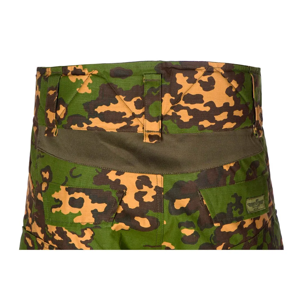 - Sob a área da cintura e ao redor dos joelhos está localizado o tecido elástico para conforto e alta mobilidade. Um nível extra de proteção é fornecido por almofadas incluídas projetadas para proteger as articulações, distribuindo eficientemente a energia do impacto. Eles podem ser ajustados firmemente ao usuário graças ao sistema de ajuste no interior dos bolsos superiores e tiras ao redor dos joelhos.