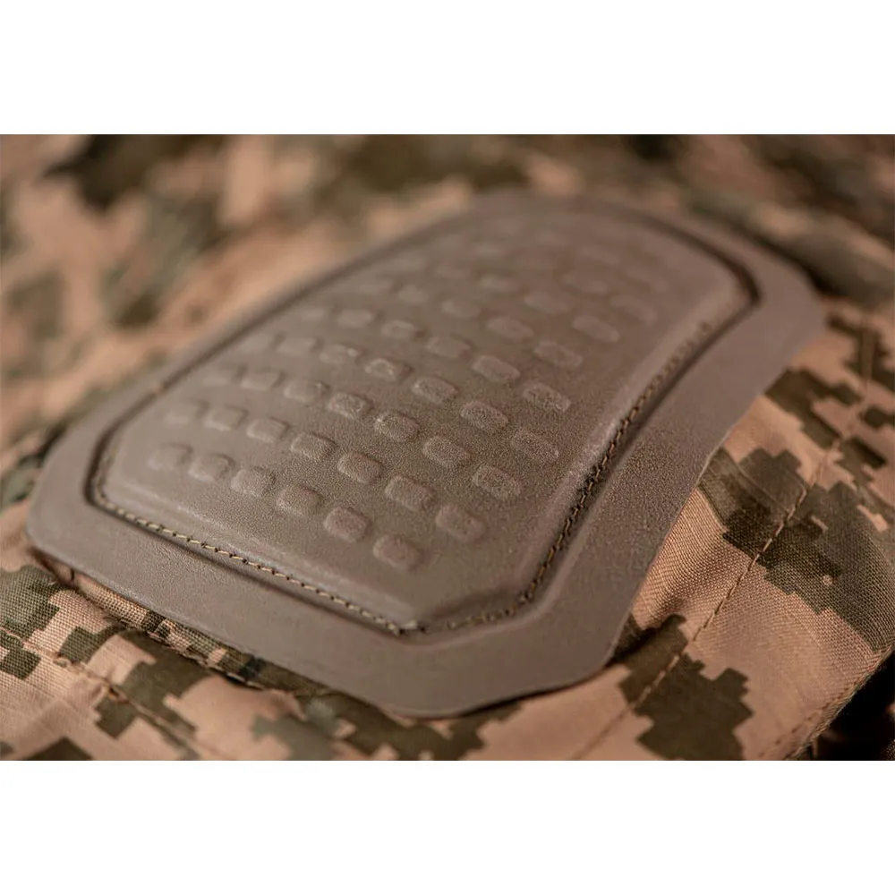 - Sob a área da cintura e ao redor dos joelhos está localizado o tecido elástico para conforto e alta mobilidade. Um nível extra de proteção é fornecido por almofadas incluídas projetadas para proteger as articulações, distribuindo eficientemente a energia do impacto. Eles podem ser ajustados firmemente ao usuário graças ao sistema de ajuste no interior dos bolsos superiores e tiras ao redor dos joelhos.