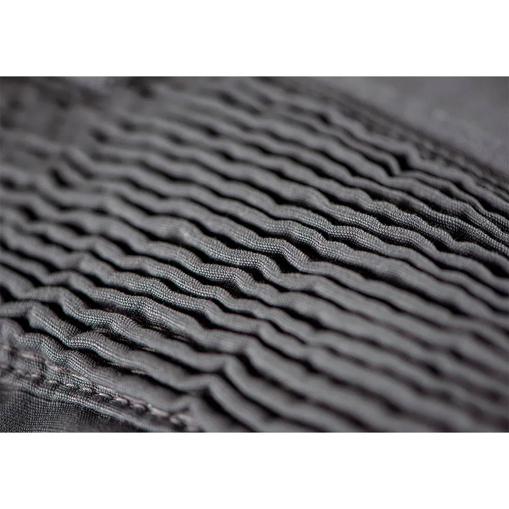 - Sob a área da cintura e em torno dos joelhos está localizado o tecido elástico para conforto e alta mobilidade. Um nível extra de proteção é fornecido por almofadas incluídas projetadas para proteger as articulações distribuindo eficientemente a energia do impacto. Eles podem ser ajustados firmemente ao usuário graças ao sistema de ajuste no interior dos bolsos superiores e tiras ao redor dos joelhos.