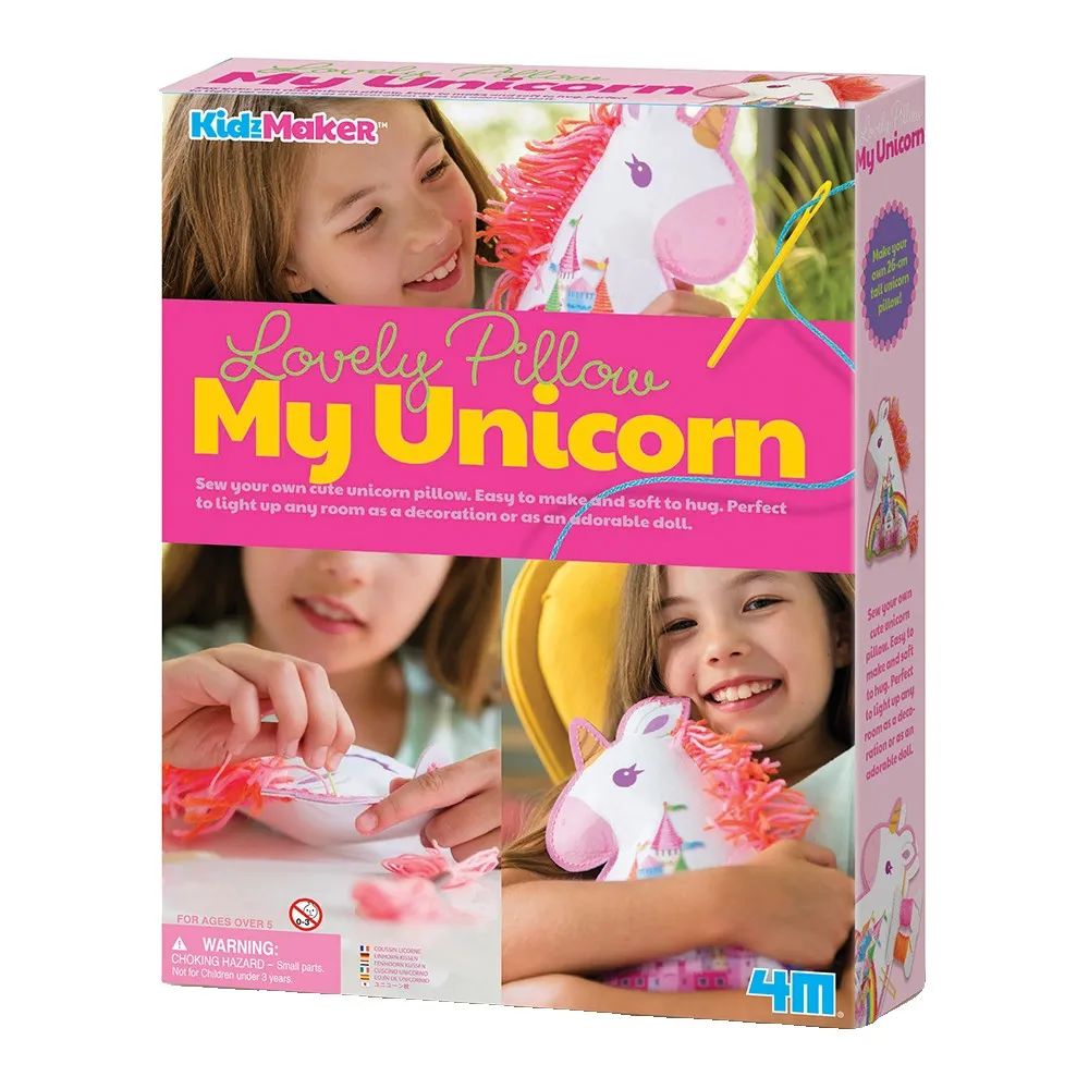 enhjørningprint, plastiknål, floss og detaljerede instruktioner.