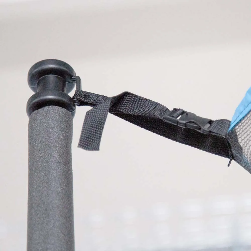 Den har et robust sikkerhedsnet understøttet af polstrede stolper og et låsesystem med lynlås og spænder.