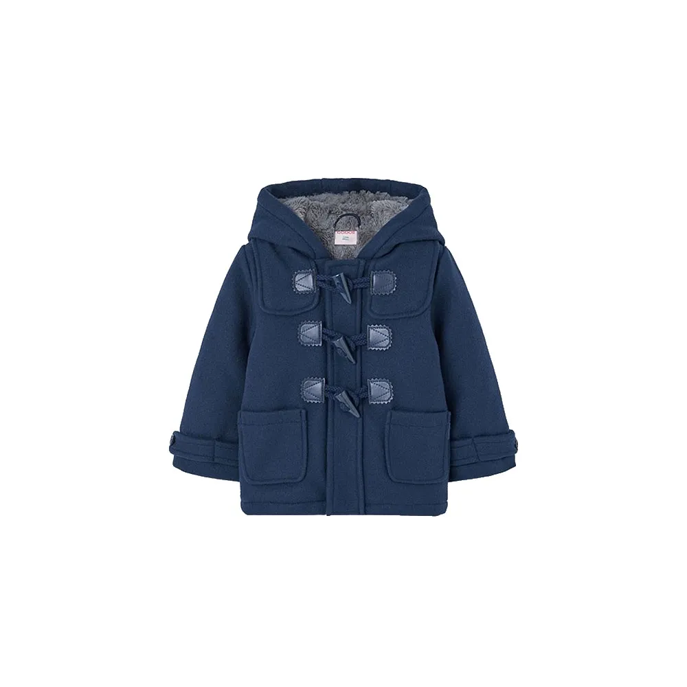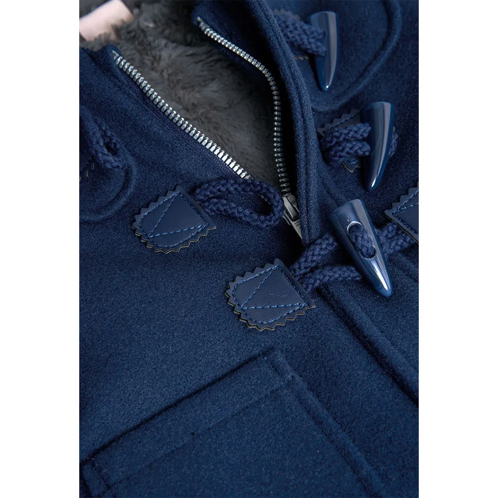 Marineblå duffelcoat til drenge, ideel til vintersæsonen, tilbyder en fremragende kombination af varme og stil.