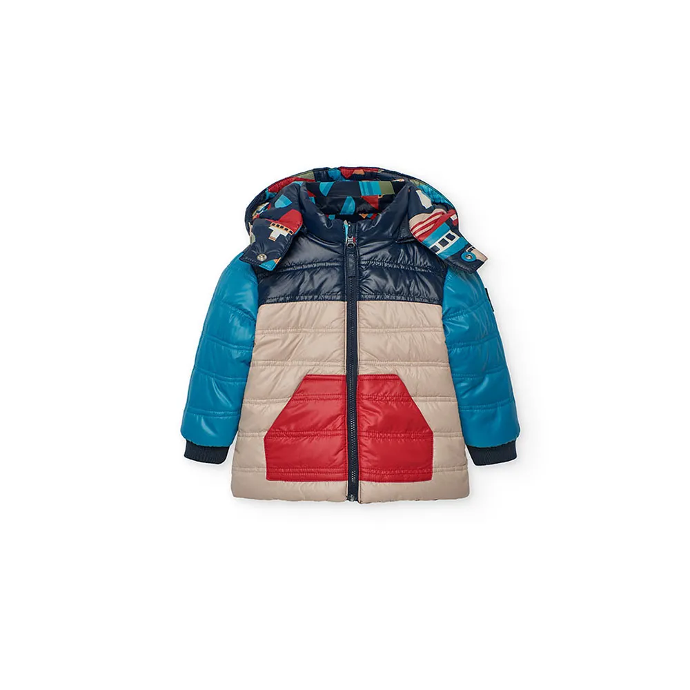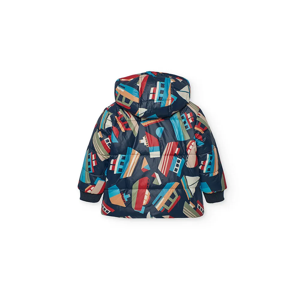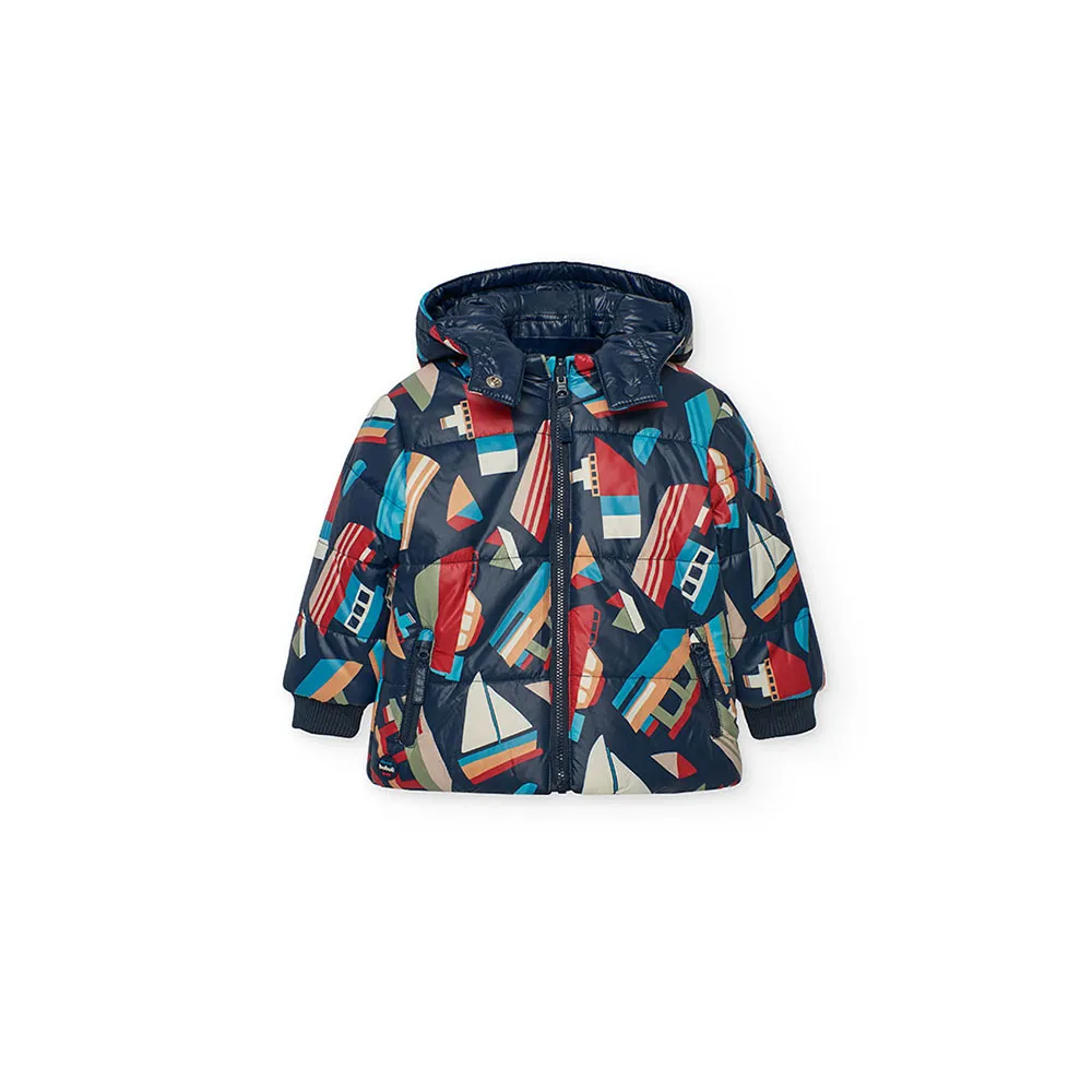 Vendbar parka i trykt, teknisk stof til drenge, en essentiel og alsidig beklædningsgenstand til børnegarderoben.