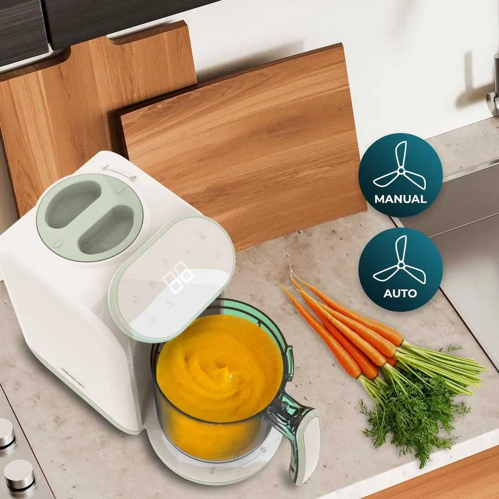 - Opnå glatte teksturer og lækre smage til din baby. Dampfunktionen damper maden, før den blendes, hvilket sikrer lethed og bekvemmelighed i tilberedningen.